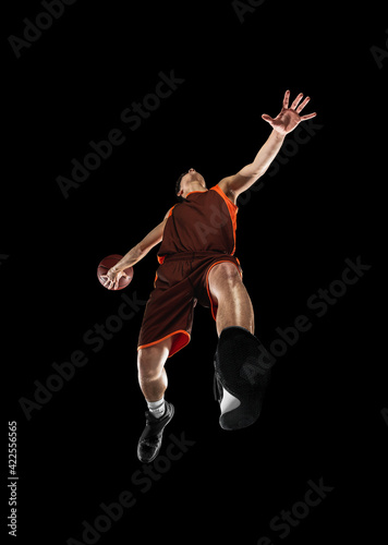 Young professional basketball player in action, motion isolated on black background, look from the bottom. Concept of sport, movement, energy and dynamic.