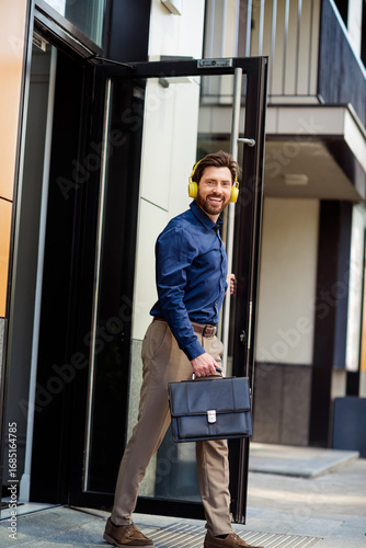 Young professional businessman exiting office building in urban area wearing casual formalwear and headphones