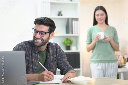 Young professional freelancing at home, texting on a phone in a stylish, well-lit living room. A woman enjoying on the sofa in the background