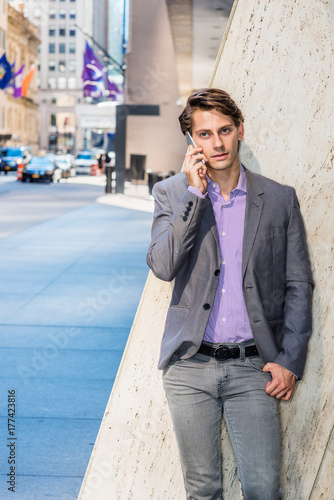 Young Professional Man calling on cell phone outside in New York, wearing gray blazer, patterned shirt, standing by column on street in Manhattan. Cars, buildings with flags on background..