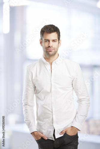 Young professional man portrait. Young financial assistant businessman wearing shirt and looking at camera while standing at the office.