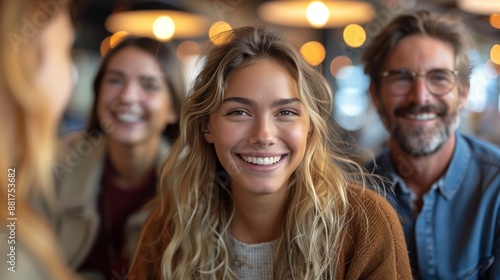 Young Professional Smiling in Meeting. Young professional woman with glasses smiling during a meeting with colleagues in a vibrant office.