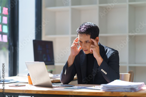 Young professional suffering from headache, massaging his temples while looking at laptop screen, experiencing work related stress in a modern office