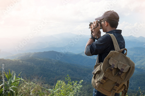 Young professional travrler man with camera shooting outdoor, fa