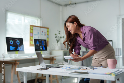 Young professional working with financial data, using calculator and laptop, demonstrating focus and expertise in business analysis within a contemporary workspace