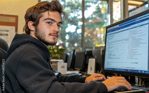 Young programmer intensely focused, navigating lines of code on his computer screen. A captivating glimpse into the digital world.