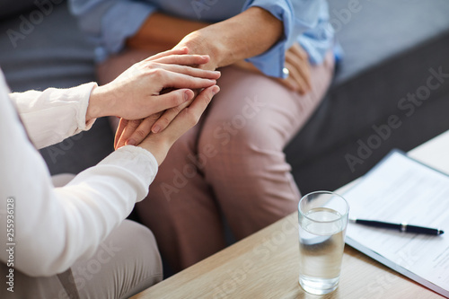 Young psychologist holding hand of her patient in need while consulting her after discussion of problem