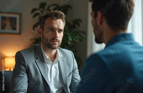 Young psychologist in suit consults client in home setting. Business meeting between therapist, patient indoors. Pro conversation, male discussing problem. Mental health, therapy, counseling session.