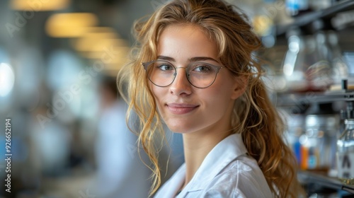 Young researcher smiles in laboratory filled with scientific equipment during daytime