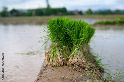 Young rice plants bundled together on a narrow muddy path in a flooded paddy field, ready for transplanting.