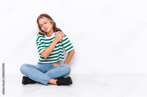 Young Russian girl sitting on the floor isolated on white background suffering from pain in shoulder for having made an effort