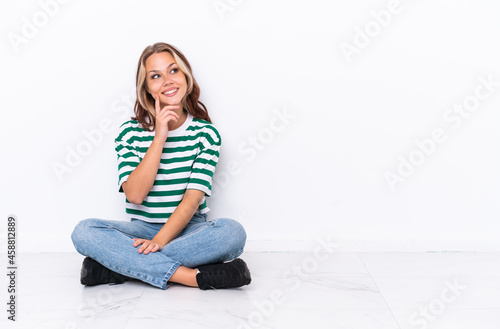 Young Russian girl sitting on the floor isolated on white background thinking an idea while looking up