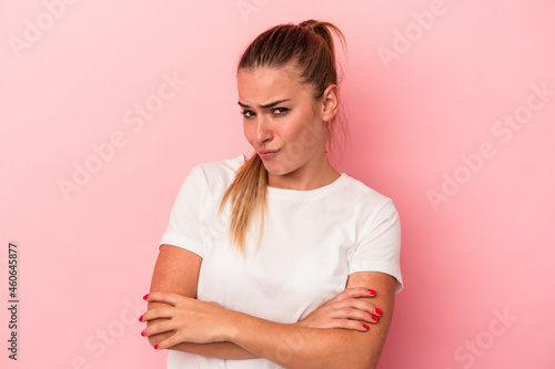 Young Russian woman isolated on pink background unhappy looking in camera with sarcastic expression.