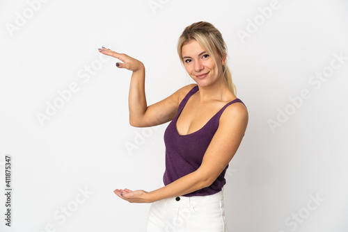 Young Russian woman isolated on white background holding copyspace to insert an ad