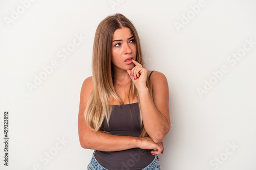Young Russian woman isolated on white background looking sideways with doubtful and skeptical expression.