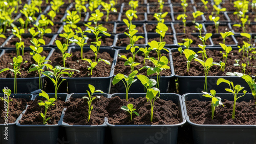 Young Seedlings Growing in Plastic Pots: Cultivating Healthy Plants in a Greenhouse Environment
