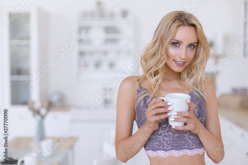 Young sexy morning girl in the kitchen in underwear with a cup of tea or coffee