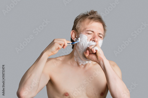 Young shirtless man covering mouth while shaving over colored background