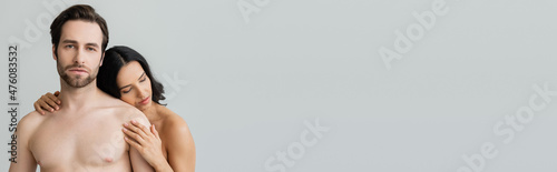 young shirtless man looking at camera near brunette woman embracing him isolated on grey, banner.