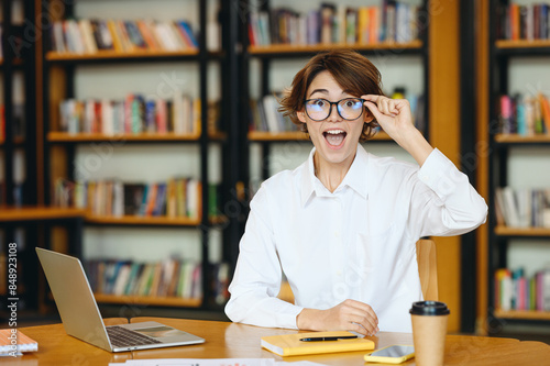 Young shocked excited happy surprised successful employee business woman wear white shirt casual clothes touch glasses looking camera sit work at office desk with pc laptop Achievement career concept