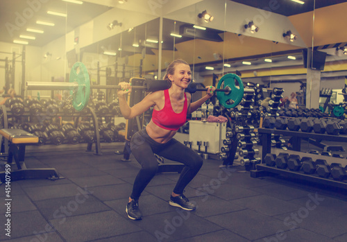 Young slim fit woman practicing squats with a barbell on her shoulders in a modern gym