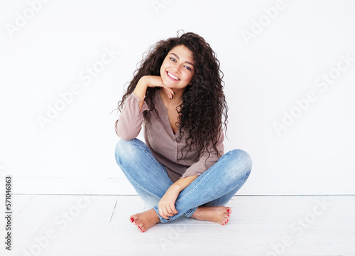 young smiling african woman wearing casual shirt, feel happy and smiling, over white background