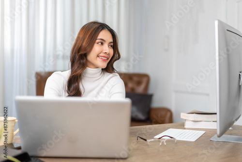 Young smiling asian woman relax using laptop conference work,learning education,study online,webinar podcast,creative woman looking at screen, shopping, online marketing at home