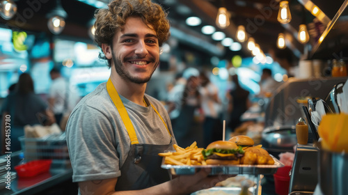 young smiling male waiter holds out tray with hamburger and french fries, fast food restaurant employee, cashier, junk food, meat, burger, guy works part-time in cafe