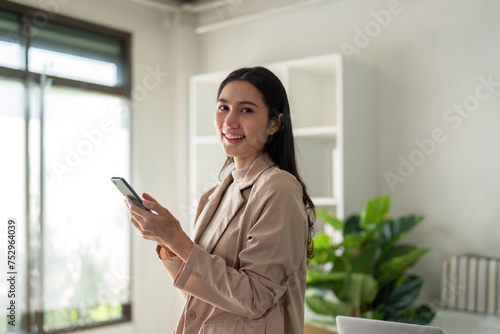 Young smiling successful employee business woman work use hold tablet stand at workplace desk at home office . Achievement career concept, green room area, sustainable lifestyle concept