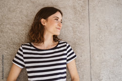 Young smiling woman stands in front of modern brown wall and looks to the side