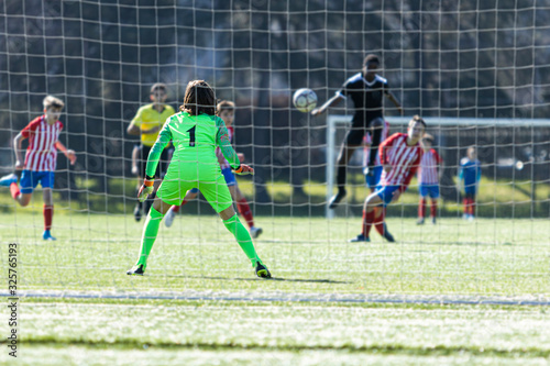 Young soccer goalkeeper behind his goal stopping a goal, back view