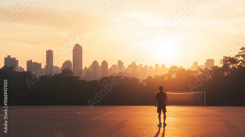Young Soccer Player Practicing at Sunset with City Skyline Background
