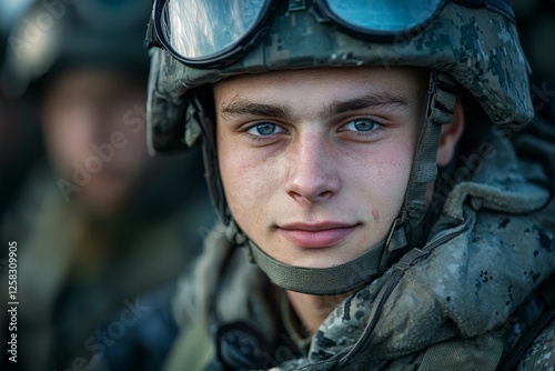 Young soldier in military gear gazes confidently with determination during training exercise in the field