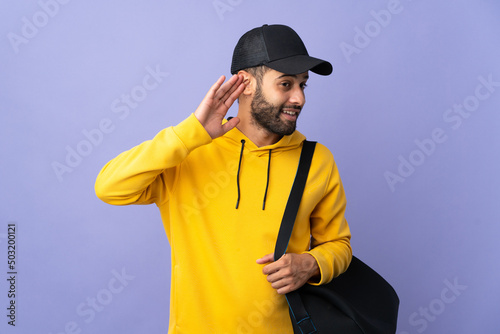 Young sport Moroccan man with sport bag isolated on purple background listening to something by putting hand on the ear