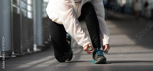 Young sports woman tying shoe lace in the city.