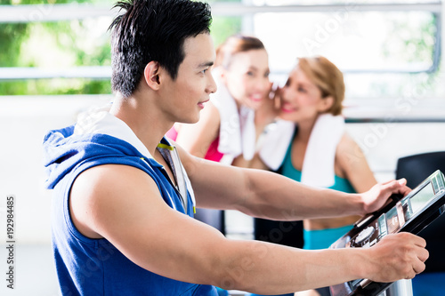Young sportsman on treadmill turns his head towards smiling girls watching him during workout