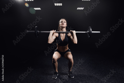 Young sporty woman doing barbell squats, black isolated background