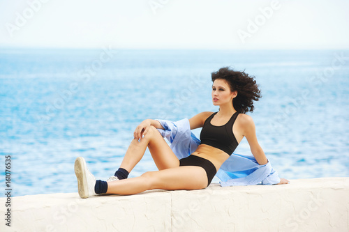 young sporty woman resting on the sea