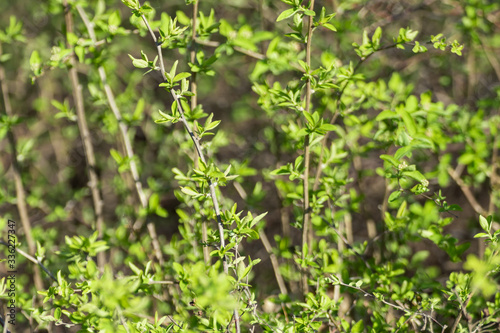 Young spring vibrant green leaves in bushes macro with blurred background. Sunny growth time natural fresh close-up