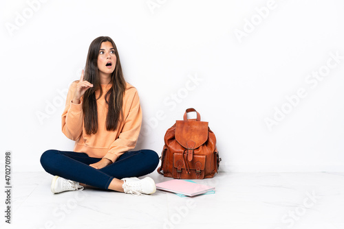 Young student brazilian woman sitting on the floor thinking an idea pointing the finger up