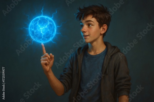 Young student interacting with floating energy ball, exploring innovative technology and sustainable energy solutions