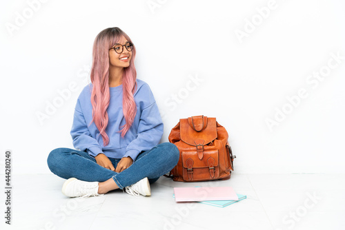 Young student mixed race woman with pink hair sitting one the floor isolated on white background looking side