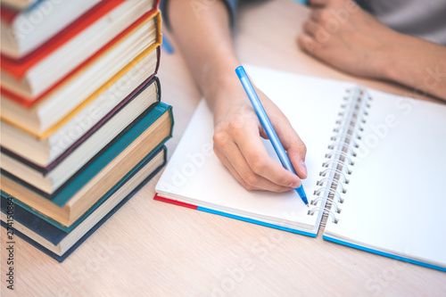 Young student sitting at desk in home studying and reading, doing homework and lesson practice preparing exam to entrance, education concept.