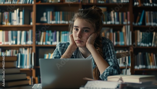 Young Student Studying in Library with Laptop, Books in Background, Thoughtful Expression