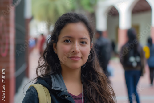 Young student with a soft smile and long hair on university campus, carrying a backpack.