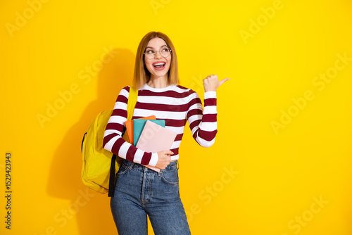 Young student with book gesturing happily against vibrant yellow background, showcasing lively fashion and cheerful style