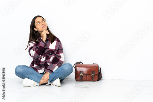 Young student woman sitting on the floor and looking up