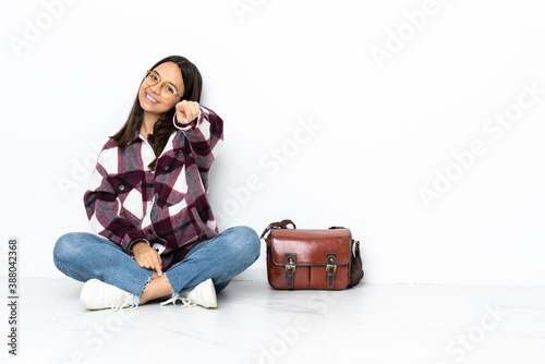 Young student woman sitting on the floor pointing front with happy expression