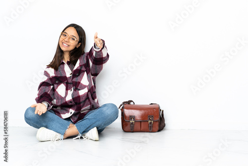 Young student woman sitting on the floor presenting and inviting to come with hand