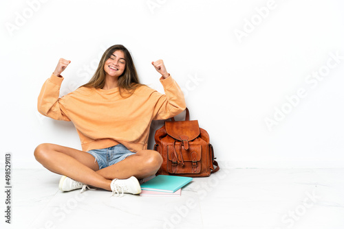 Young student woman sitting on the floor with a laptop isolated on white background doing strong gesture